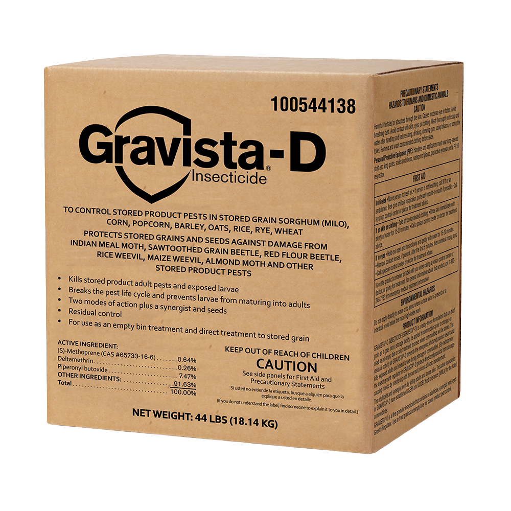 Gravista®-D Insecticide is the ideal on-farm solution to help prevent stored product insects in post-harvest stored grain. It is labeled for use in stored grain sorghum (milo), corn, popcorn, barley, oats, rice, rye, wheat. Gravista®-D Insecticide is a dry formulation product that kills labeled insects and breaks their life cycles, providing excellent control of Indian meal moths, sawtoothed grain beetles, red flour beetles, rice weevils, maize weevils, lesser grain borers, and other listed pests (see label).