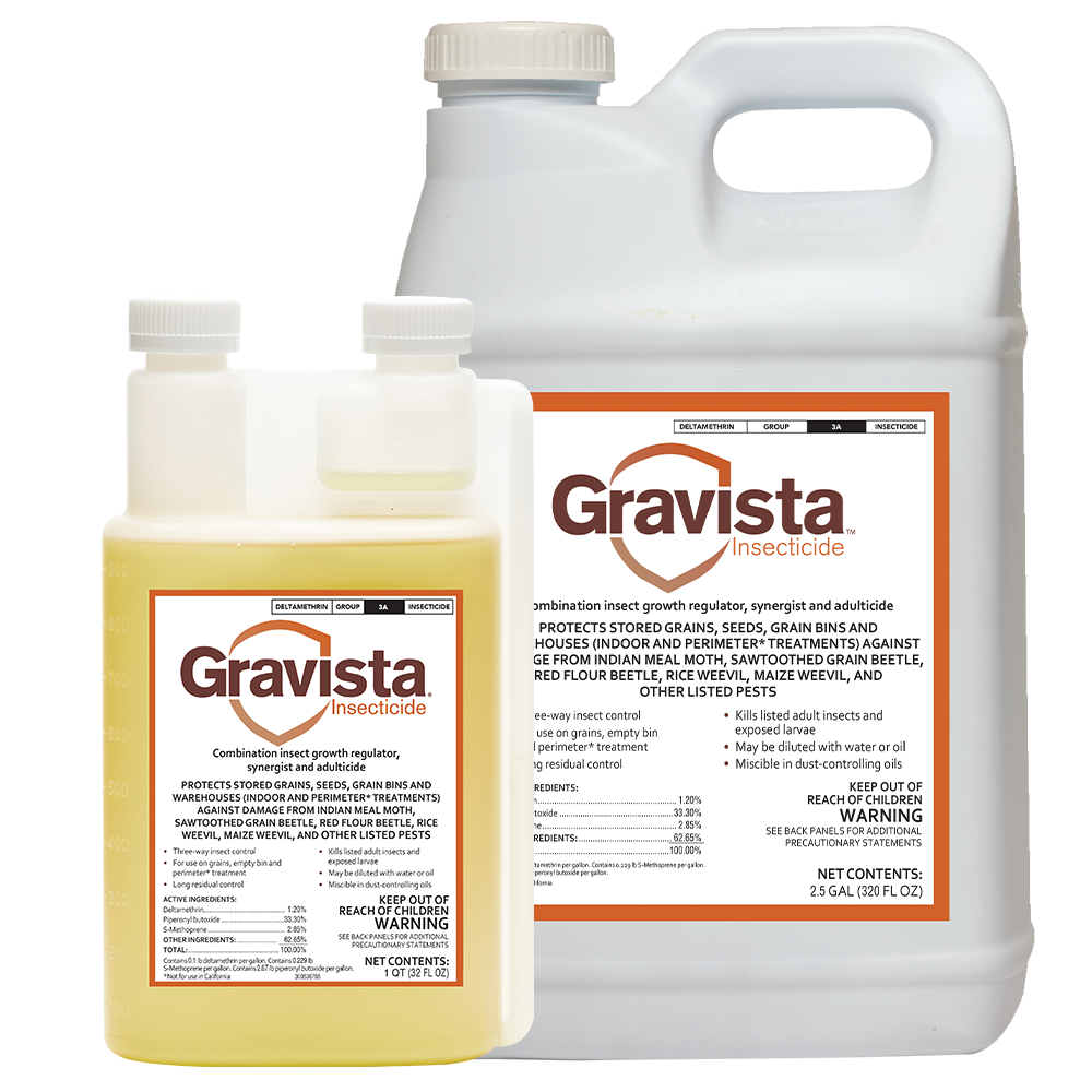 Featuring 3-in-1 insect control with an adulticide, an insect growth regulator (IGR) and a synergist, Gravista® Insecticide kills labeled insects and breaks their life cycles. The product provides excellent control of Indian meal moths, sawtoothed grain beetles, red flour beetles, rice weevils, maize weevils, lesser grain borers, and other listed pests (see label).
